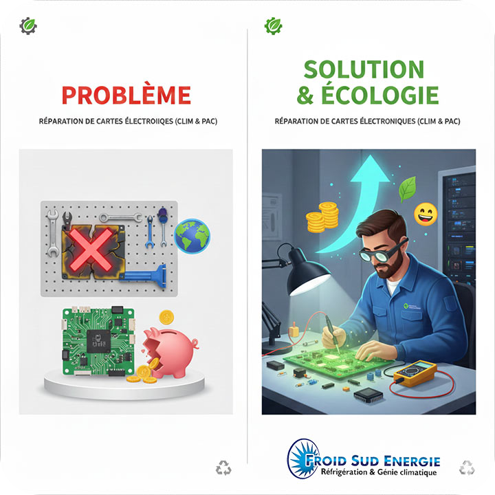 La réparation électronique est l'un des piliers de l'économie circulaire. Dans un secteur comme celui du CVC (Chauffage, Ventilation, Climatisation), où les équipements sont volumineux et riches en métaux rares, réparer une carte plutôt que de remplacer l'unité complète a un impact écologique massif.